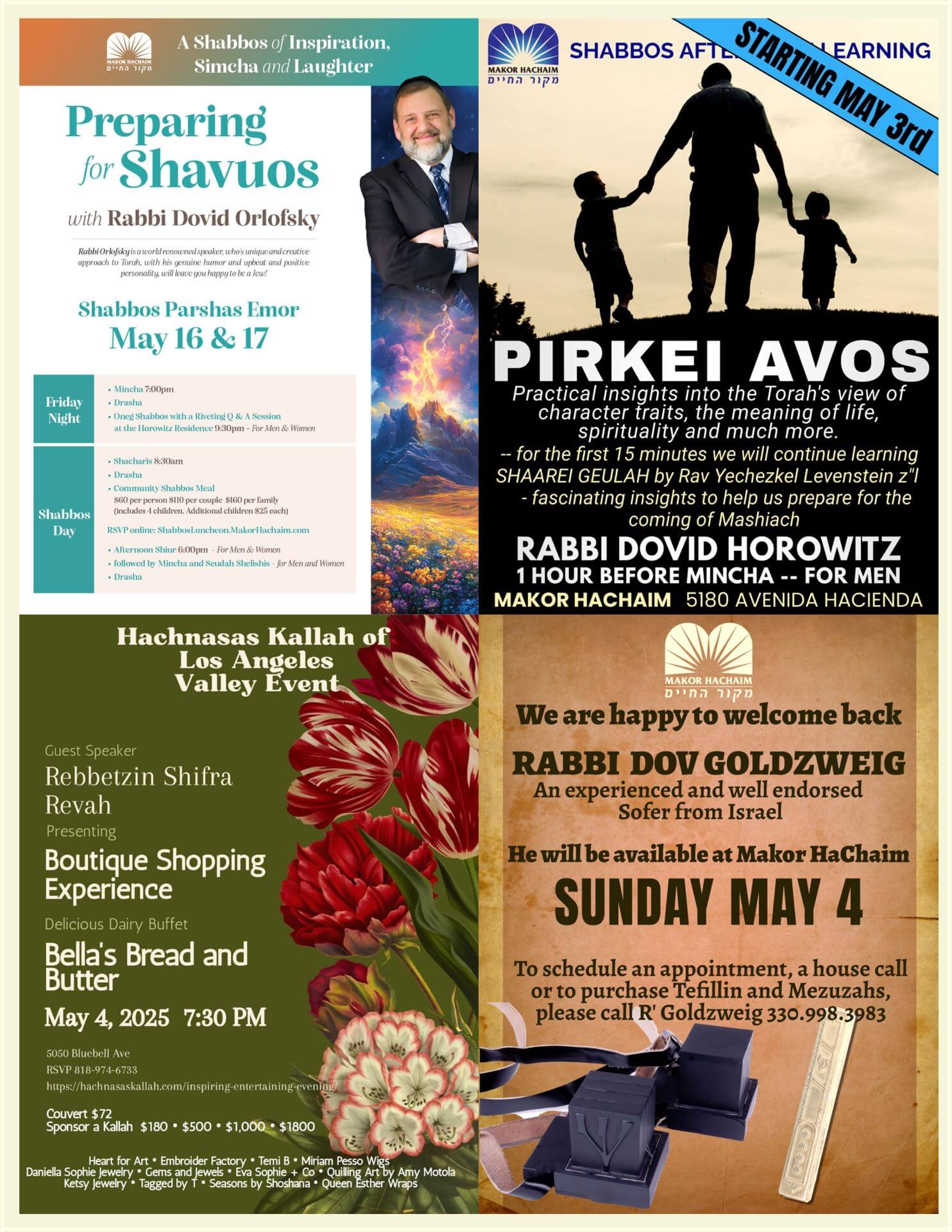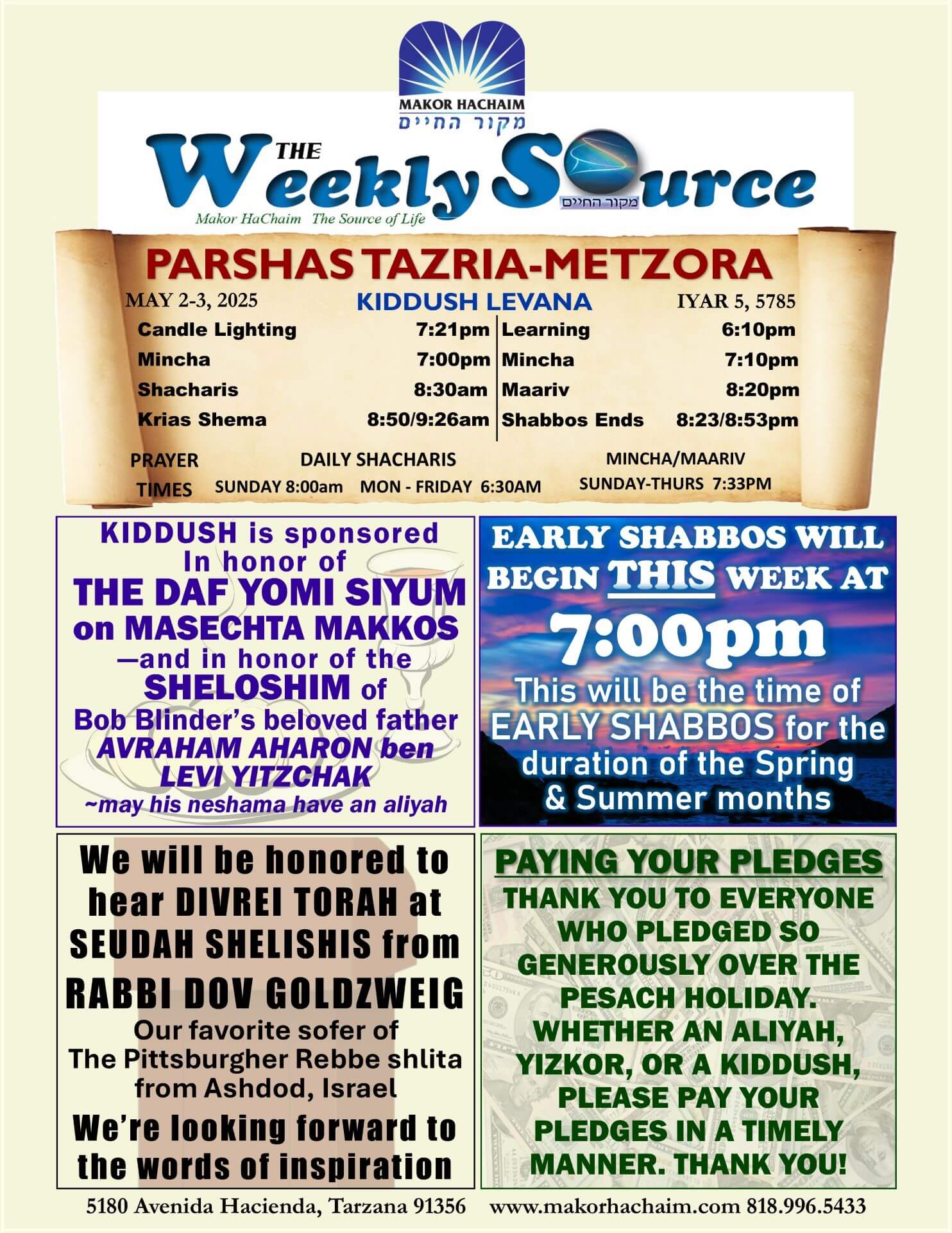 Parshas Tazria-Metzora: Early Shabbos at 7pm, Mazel Tov Siyum, TorahAnytime Shiur, Pirkei Avos on Shabbos Afternoon, R’ Goldzweig the Sofer, Rabbi Orlofsky in 2 Weeks, and more…